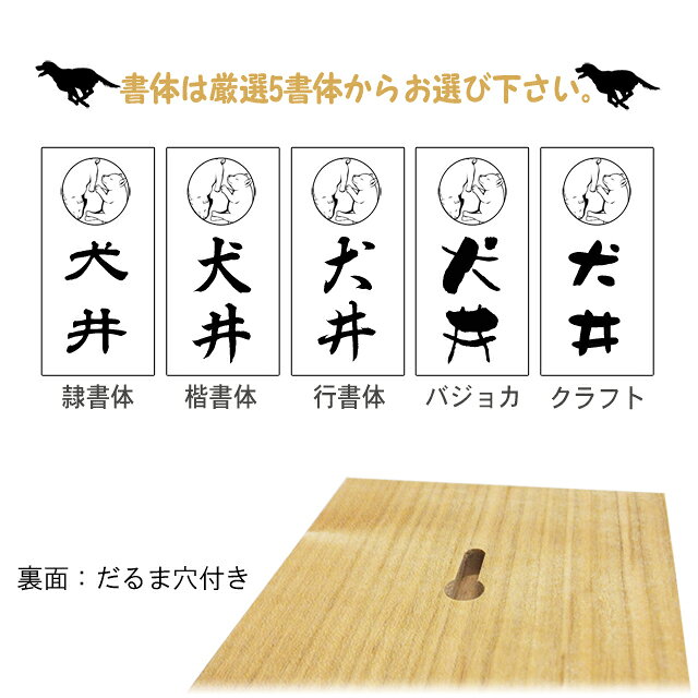 特徴 犬のイラスト家紋がかわいい、イヌ好きのための天然木表札。