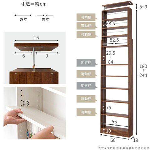 】 耐荷重 固定棚:(約)20kg可動棚:(約)15kg 商品サイズ (約)幅60cm×奥行き19cm×高さ185〜253cm※つっぱり部9cmで設置の場合 商品重量 (約)19.3kg 梱包サイズ 1.(約)幅99cm×奥行き28cm×高さ16cm2.(約)幅63.5cm×奥行き23cm×高さ21cm 梱包重量 1.(約)12.1kg2.(約)9.3kg 梱包数 2個口 生産国 中国 組み立て お客様組み立て品 工具 プラスドライバーゴムハンマー軍手・あて布※工具はお客様でご用意ください。